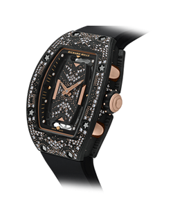 腕表的表圈和底盖由Carbon TPT®碳纤维材质加工而成,这是一种具有独特大马士革纹外观的独家材质。该材质表面呈现出极其规则的条纹状,非常引人注目。这是因为 Carbon TPT®碳纤维材质由通过分离碳纤维所获得的多层平行细丝组成。这些厚度不超过30微米的碳纤维层,先在模具中浸泡后,再经由特殊机器处理,使得层与层之间的纤维丝以45度角交错。接下来,在6巴的压力下将Carbon TPT®碳纤维加热至120度,最后便可在RICHARD MILLE的工坊中加工成型。与其他技术先进的碳材质相比,Carbon TPT®碳纤维材质的断裂应力发生率下降了 25%,微裂纹发生率下降了 200%。