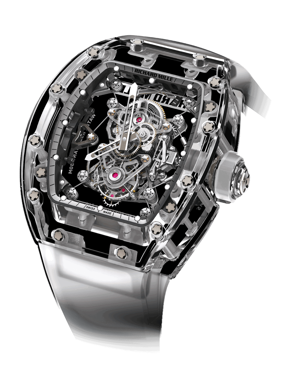 RM 56-02的整个表壳前框、表壳带和后框都是用实心蓝宝石块切割和研磨而成的。