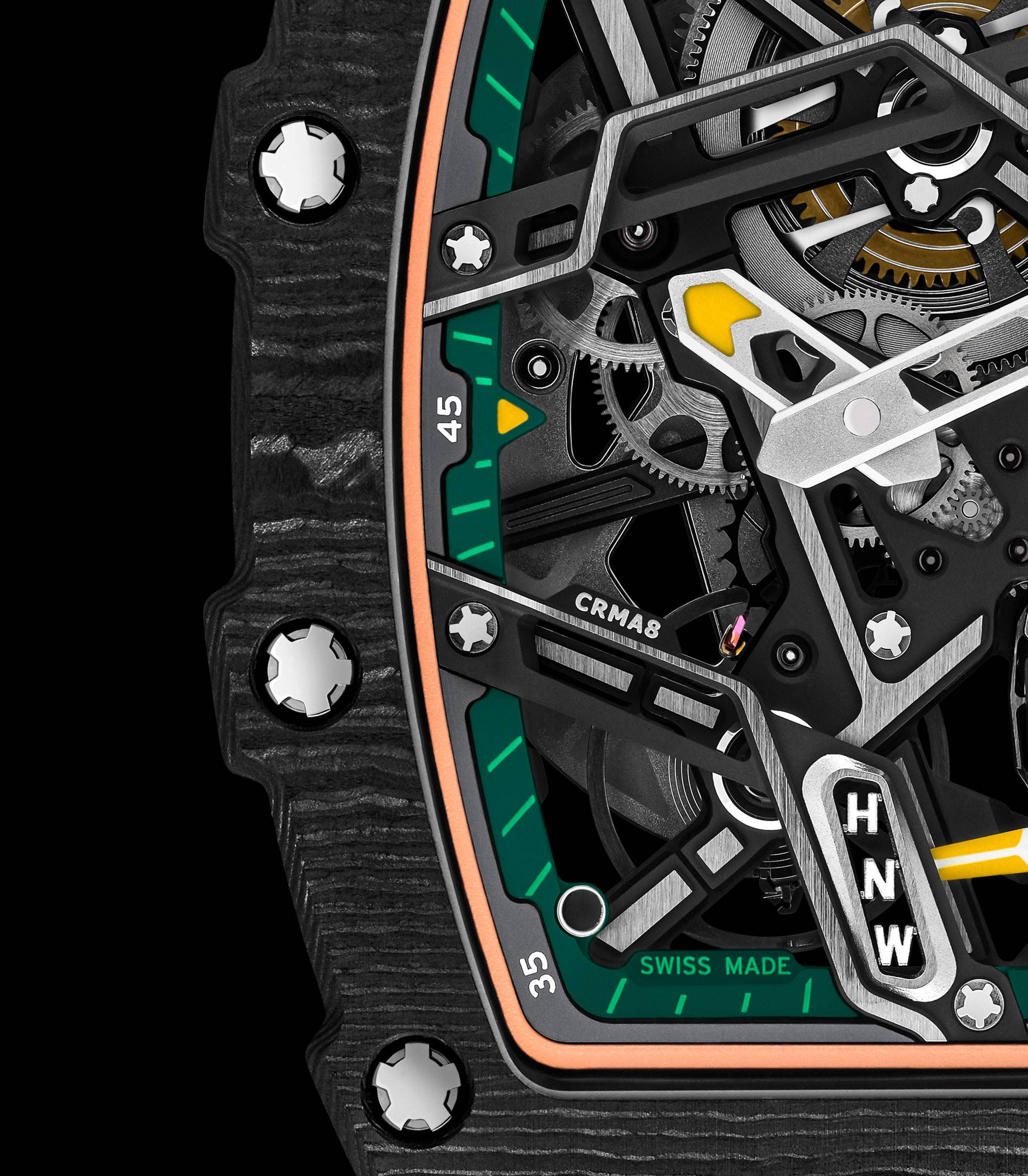 RM 07-04自动上链运动腕表及其CRMA8机芯的研发前后耗时三年,期间克服了诸多难题:这款品牌自主研发的镂空自动机芯,其结构小巧紧凑,在确保可以承受5,000g加速度冲击的同时将表壳与机芯完美融合,并且腕表的内部运转一览无余。至臻的精工修饰将这款毫不妥协的机械结构彰显得分外优雅。机芯的结构高度紧凑,大大增加了制表师的装配耗时,容不得丝毫差错,凸显了制造水平的卓越品质。