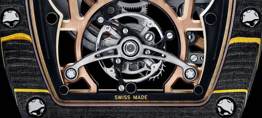 Gold Carbon TPT®金碳纤维是一种高科技材料,由分离碳丝所获得的600层平行碳纤维层所组成。这些薄层厚度不超过30微米,被浸泡于黑色基质中,然后再采用专门用于堆叠薄层的机器进行组装,使分层与金箔层之间的纤维丝以45度角交错。由于金在化学上是一种贵重材料,因此NTPT和RICHARD MILLE的工程师很艰难地确保它与碳纤维准确地“融合”。