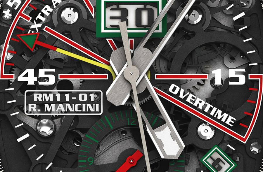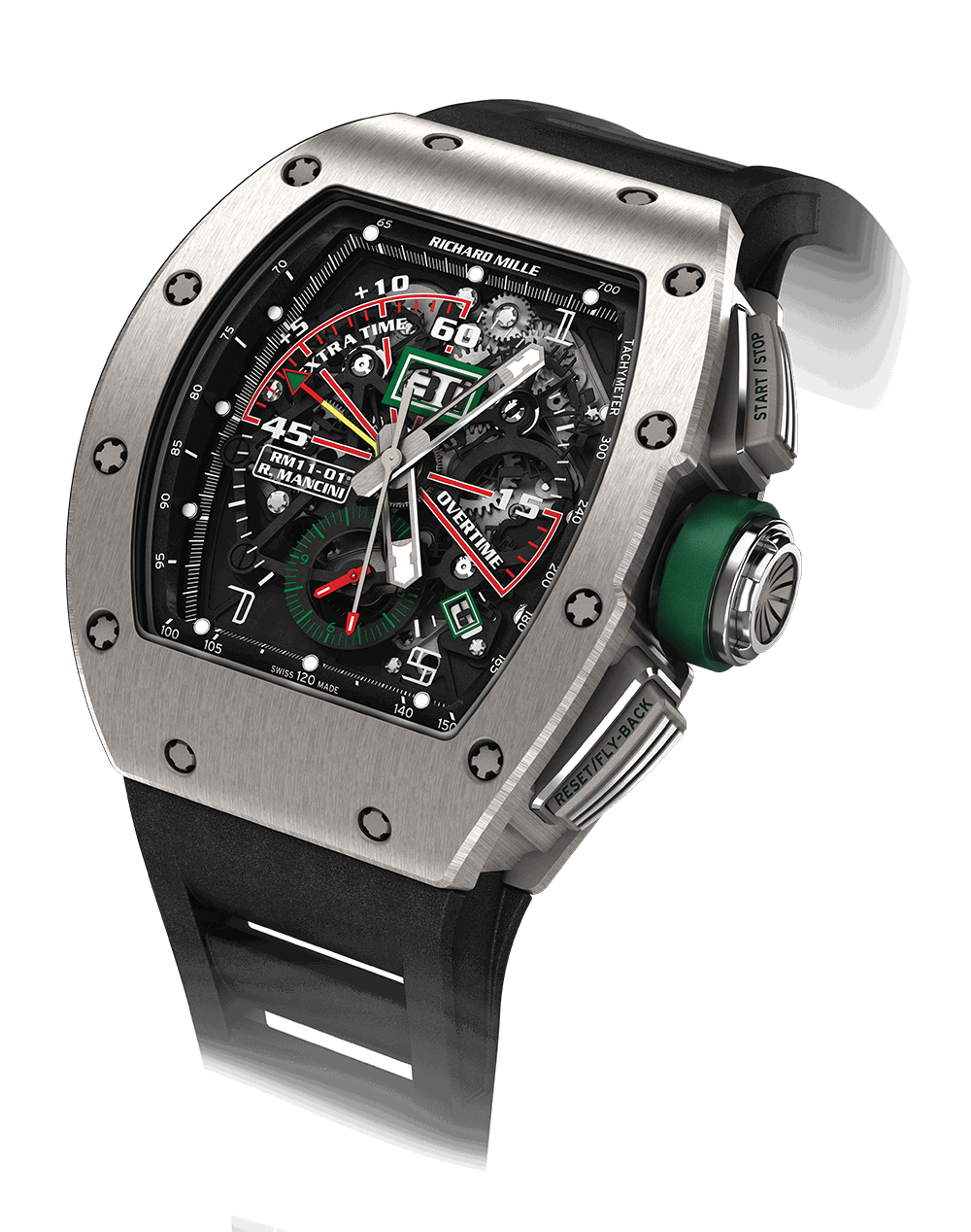 在4点到5点之间使用推杆,可以重置运行中的计时表,而无需先停止机构。RM 11-01的反弹回计时表是为足球比赛设计的。