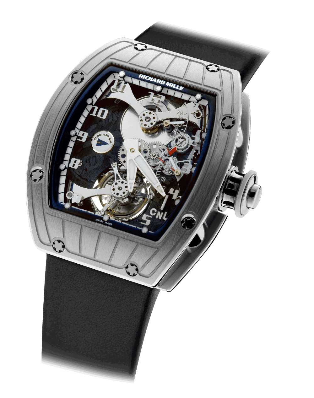 手动绕线陀飞轮运动,包括小时、分钟、功率储备指示器、扭矩指示器和功能选择器。