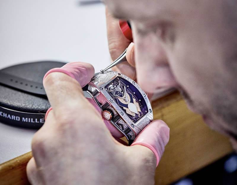 每一个表盘只有0.9毫米厚,都是用珍珠母、玛瑙和钻石手工制作的。这是一个巨大的技术挑战,因为许多不同的精加工操作需要:喷砂,抛光,设置。。。所有这些都是在一个很小的区域内,分几层排列的。