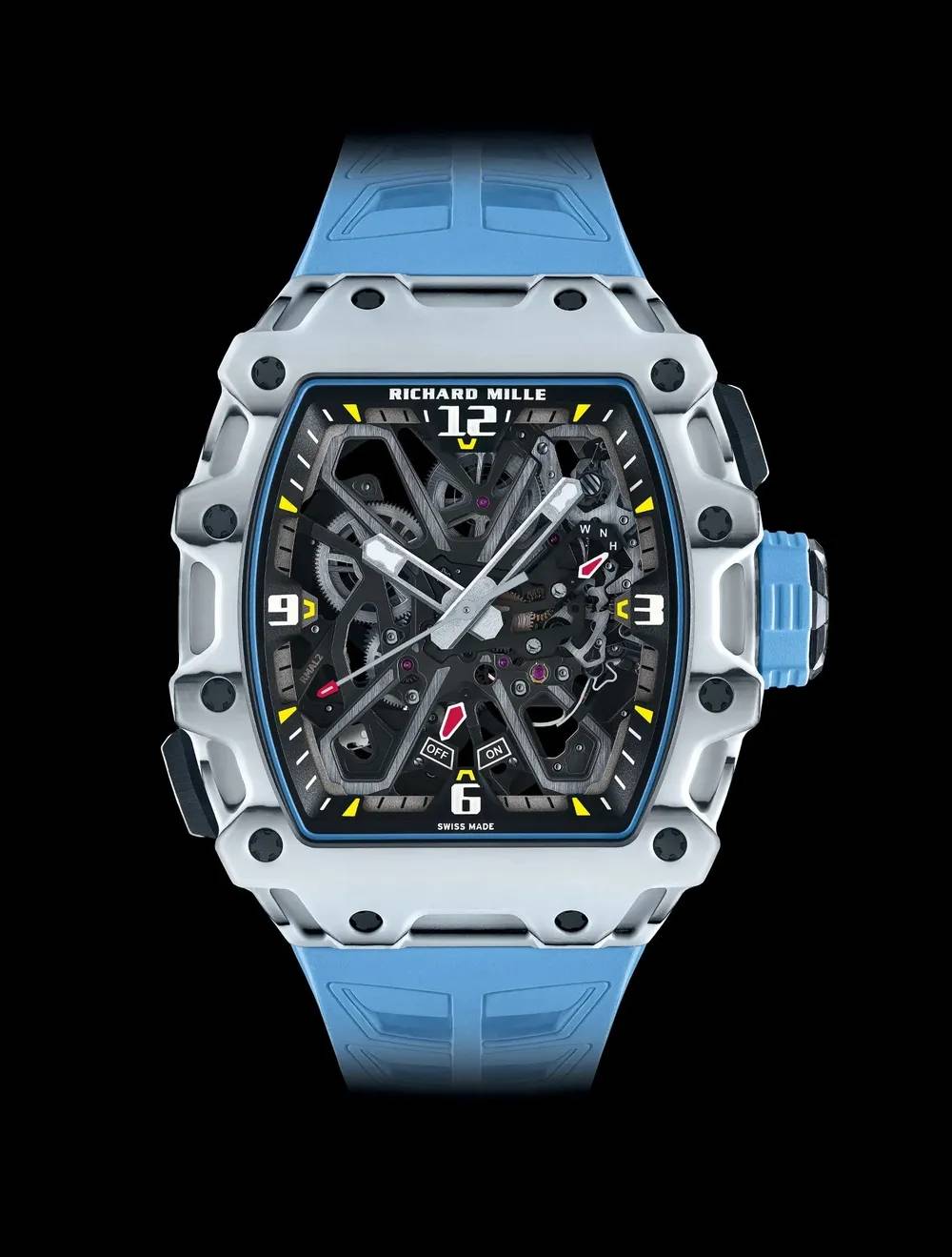 两种版本供选:蓝色Quartz TPT®石英碳纤维表壳搭配白色Quartz TPT®石英碳纤维中层表壳;白色Quartz TPT®石英碳纤维及Carbon TPT®碳纤维表壳搭配Carbon TPT®中层表壳,其凹槽与RM 27-04 Rafael Nadal陀飞轮腕表类似。
