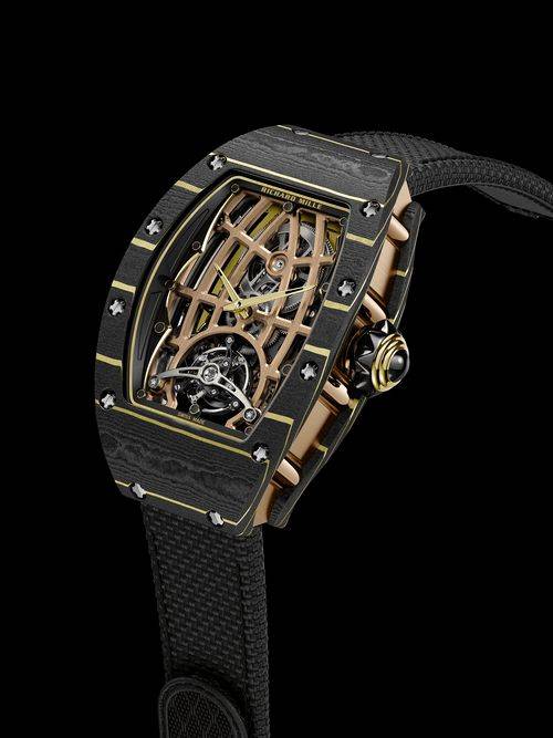 Gold Carbon TPT®金碳纤维是一种高科技材料,由分离碳丝所获得的600层平行碳纤维层所组成。这些薄层厚度不超过30微米,被浸泡于黑色基质中,然后再采用专门用于堆叠薄层的机器进行组装,使分层与金箔层之间的纤维丝以45度角交错。由于金在化学上是一种贵重材料,因此NTPT和RICHARD MILLE的工程师很艰难地确保它与碳纤维准确地“融合”。这种材料在一个类似用于制造航空部件的高压釜中加热至120度、并加压至6巴之后,便可送往RICHARD MILLE的工厂加工成型。