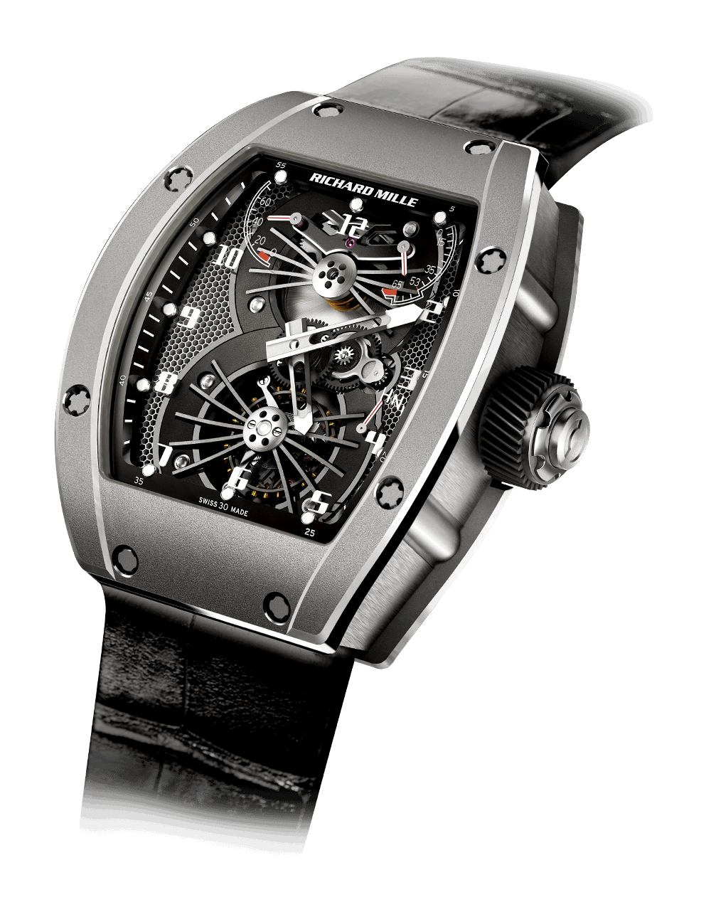 RM 021陀飞轮航空公司是第一款由钛和蜂窝状正交钛铝合金制成的带有碳纳米纤维芯的手表。