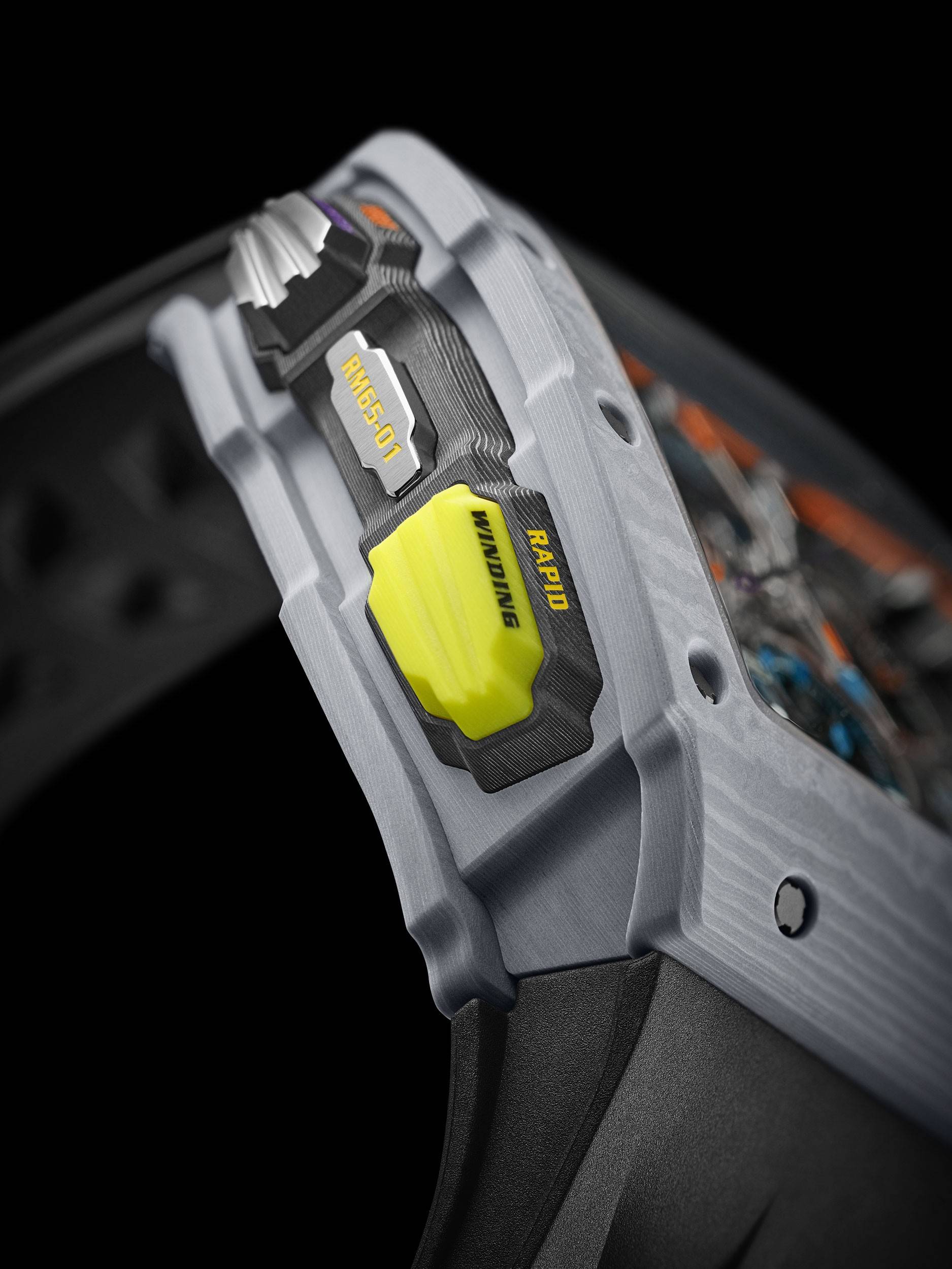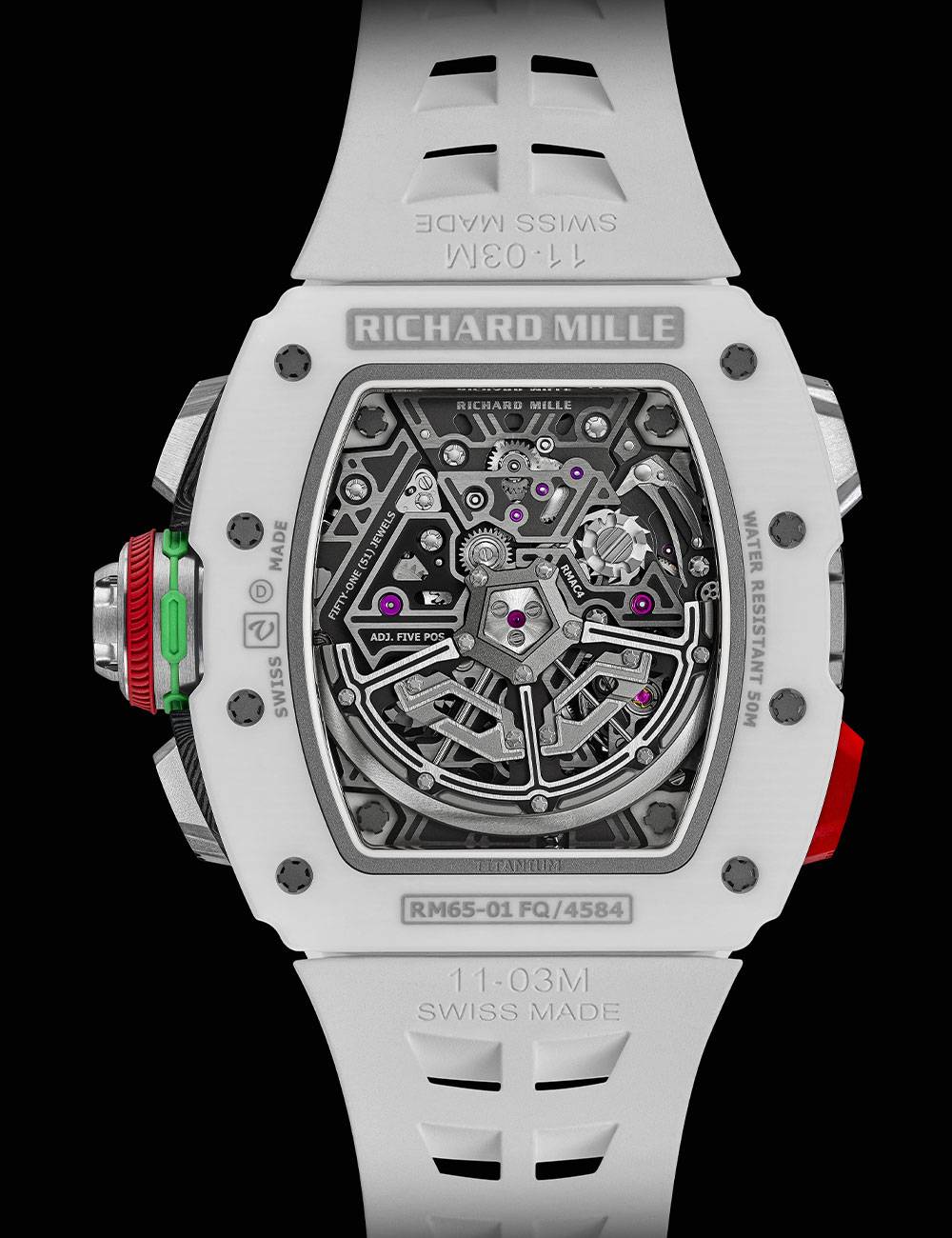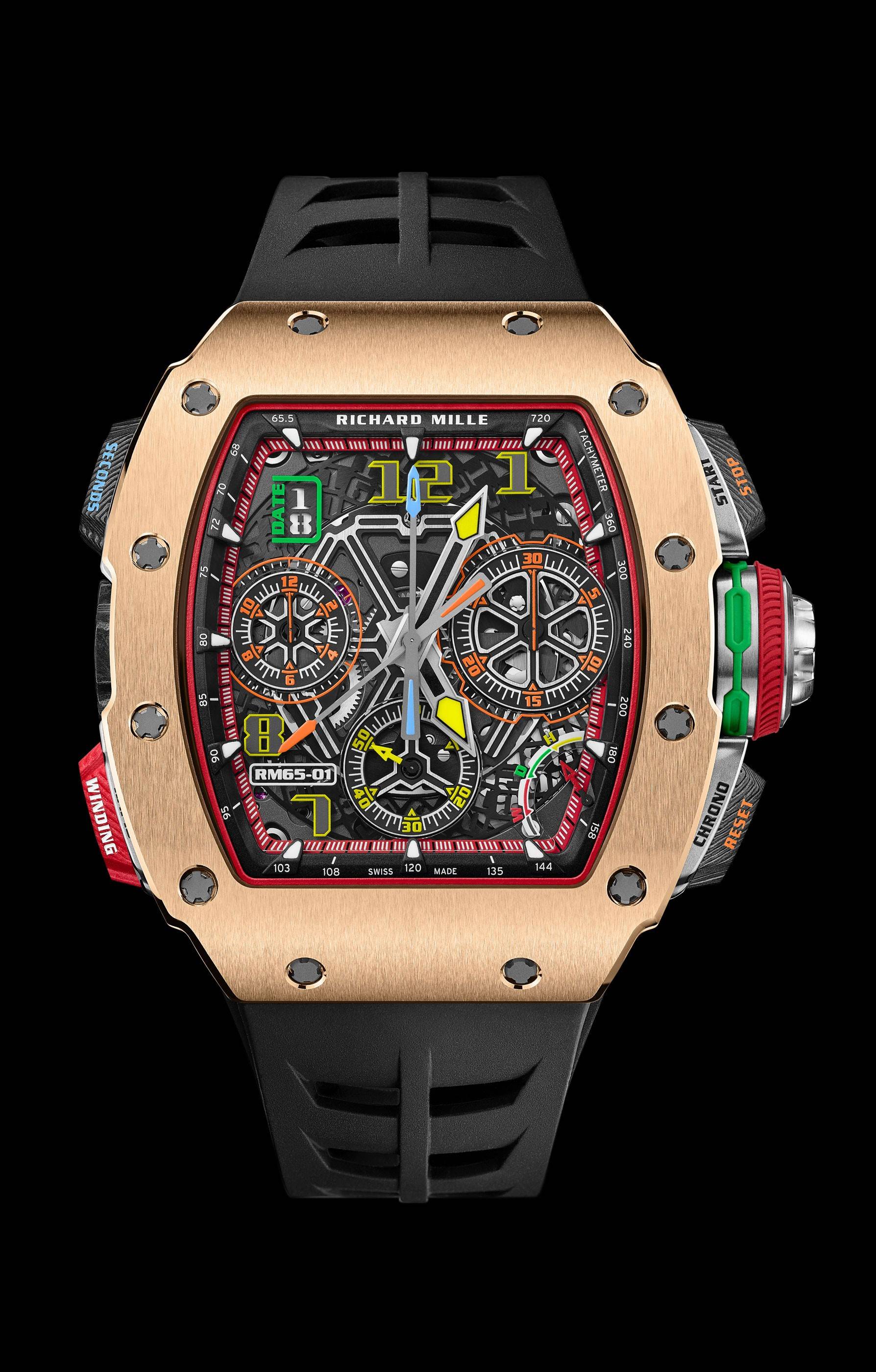RM 65-01体现我们如何诠释一款以赛车运动为灵感的高度复杂计时码表。 它充分体现了我们的技术方法,因为其中融入了若干附加功能、特殊的架构和崇高的美学外观。