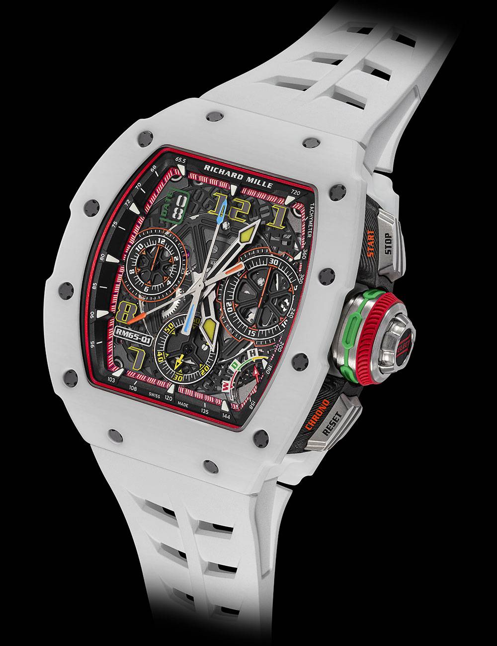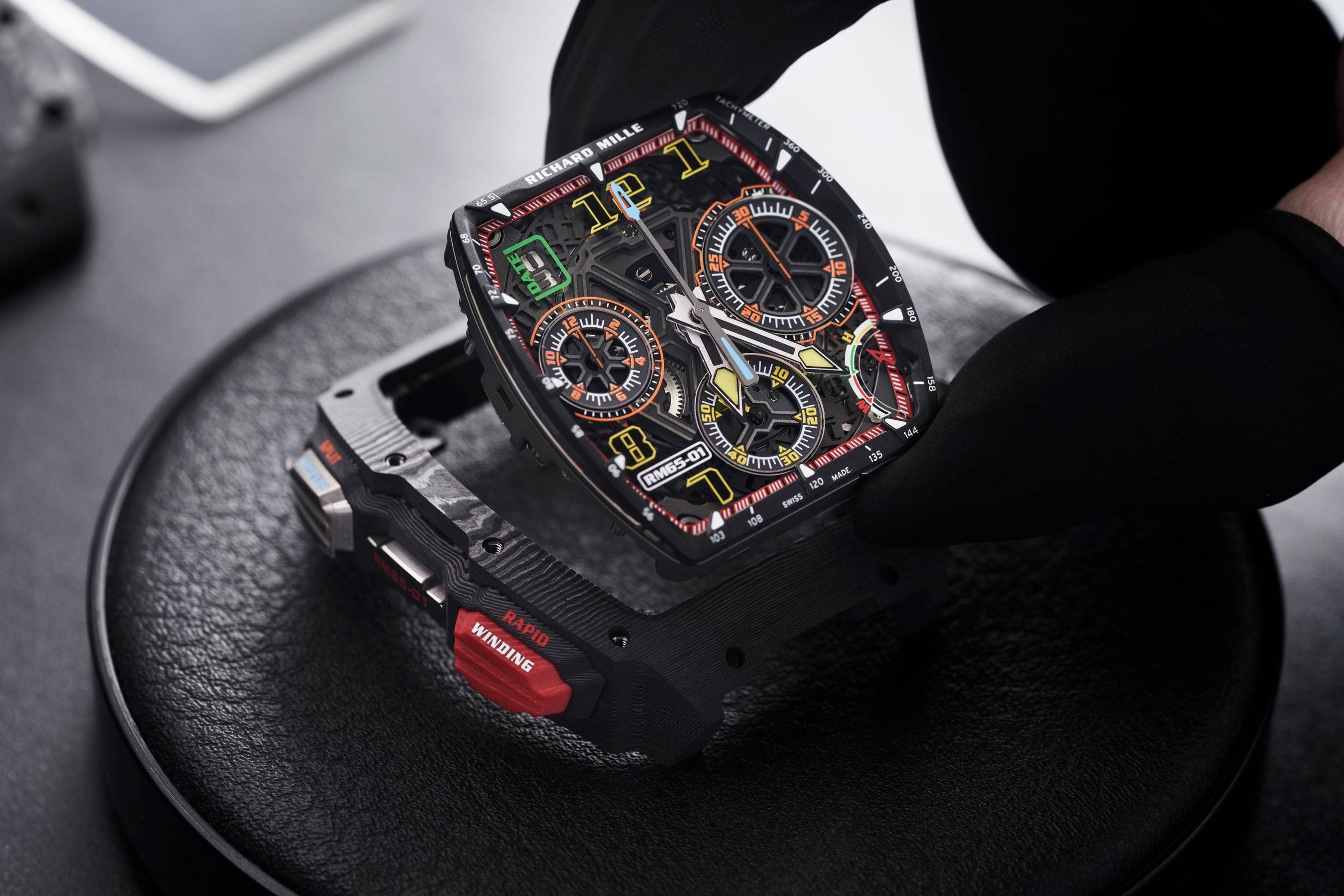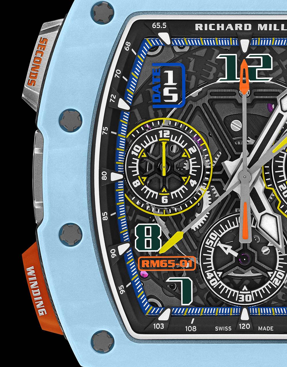 RM 65-01体现我们如何诠释一款以赛车运动为灵感的高度复杂计时码表。 它充分体现了我们的技术方法,因为其中融入了若干附加功能、特殊的架构和崇高的美学外观。