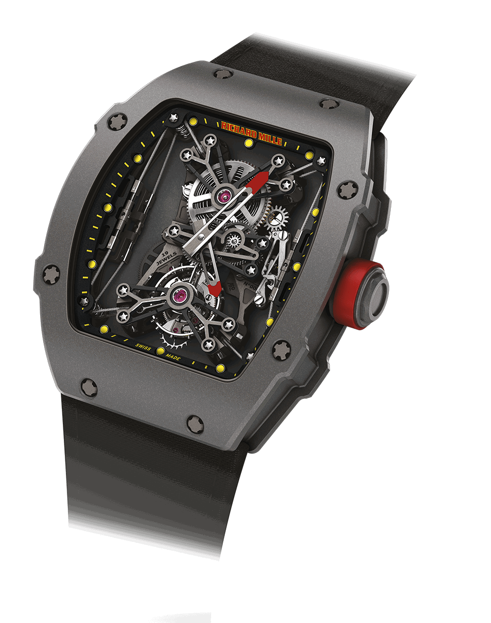 一旦钟表匠穿上电缆,他就用专用工具转动中央张紧器环来张紧电缆。设计用于在其外壳内保持悬挂,口径RM27-01可以承受超过5000克的加速度。
