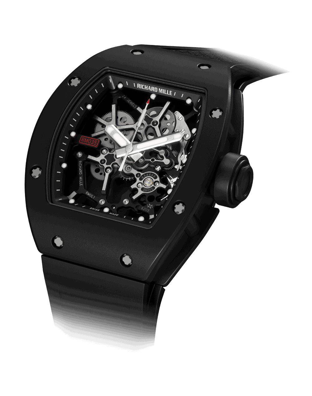RM 035的外壳防水50米,由2个丁腈O形密封圈确保,并用12个5级钛花键螺钉和316L不锈钢耐磨垫圈组装。