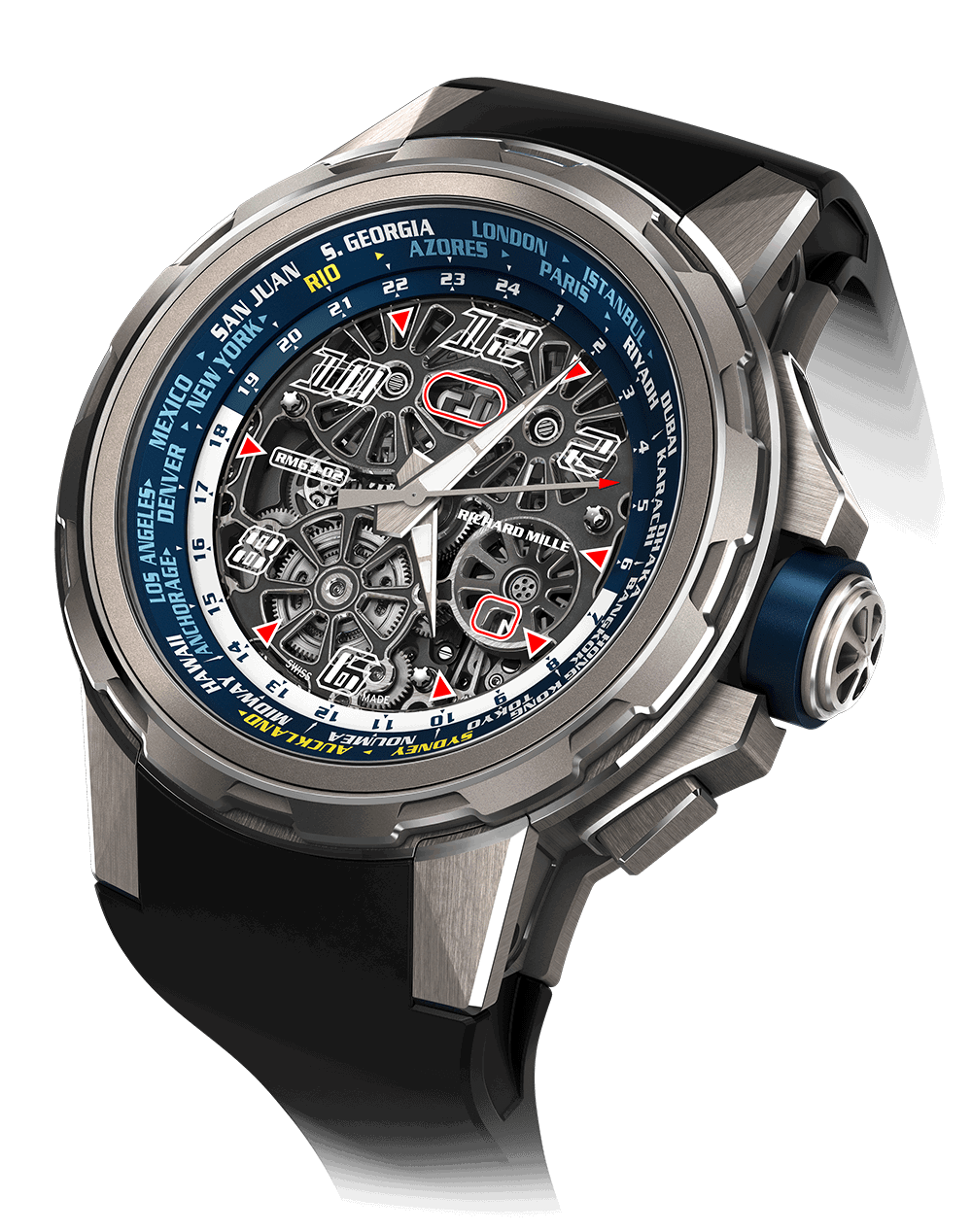 理查德·米勒首次在2013年国际高级钟表沙龙上展示了58-01室陀飞轮世界计时器。