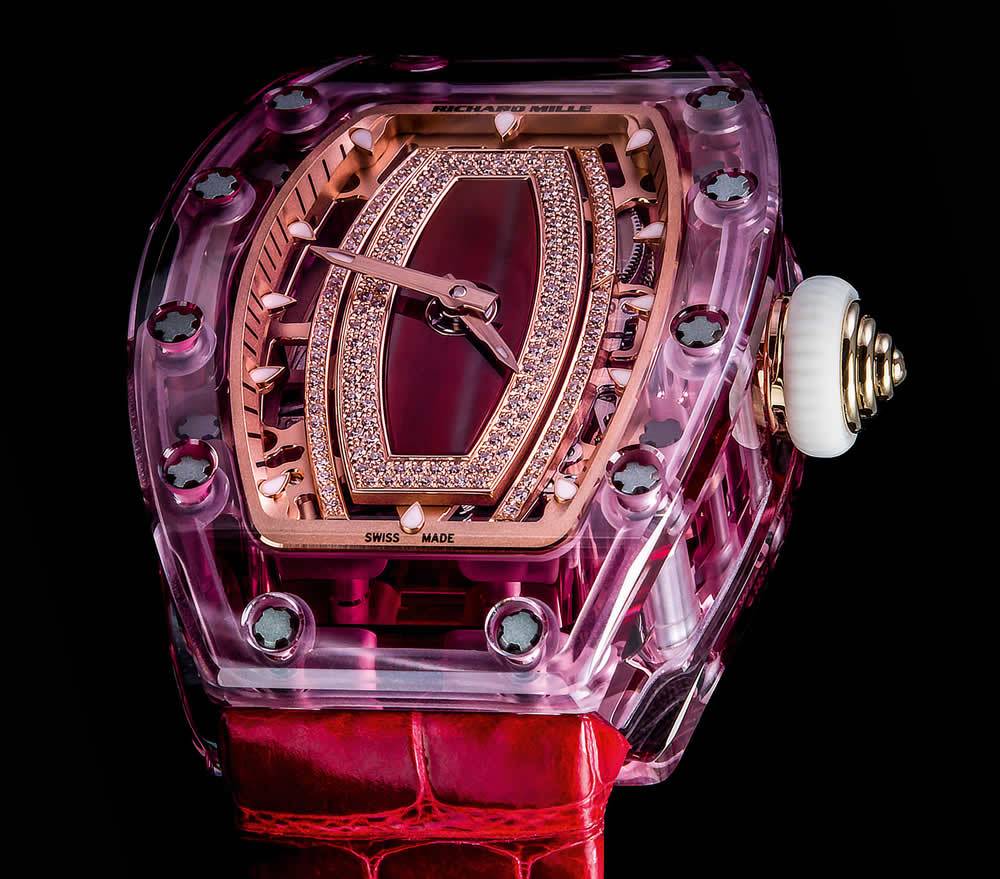 Rm07-02的边框、表带和表壳背面是由粉红色蓝宝石实心块制成的。